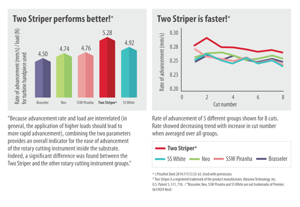 Always the Diamond Standard, Two Striper® lasts longer and delivers faster, cooler cutting than electroplated brands. Which means fewer burs, less chair time and happier patients. Made from a select grade of natural diamonds, only Two Striper burs are developed with a proprietary P.B.S.® brazing process that is recognized as the best bonding system in the industry. You can count on Two Striper® for efficient, predictable results.